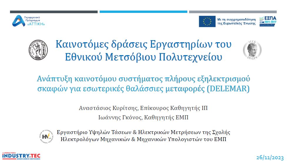 Τα πρώτα αποτελέσματα του σχεδιασμού του DELEMAR παρουσιάστηκαν στο πλαίσιο της 1ης διεθνούς έκθεσης “INDUSTRY.TEC / Βιομηχανικός Εξοπλισμός” στο εκθεσιακό κέντρο MEC στην Παιανία, σε εκδήλωση που πραγματοποιήθηκε την Κυριακή 26 Νοεμβρίου 2023, στις 13:30– 14:30, στη Συνεδριακή Αίθουσα του MEC. Ο τίτλος τη εκδήλωσης ήταν «Καινοτόμες δράσεις Εργαστηρίων του Εθνικού Μετσόβιου Πολυτεχνείου στο Industry.tec Forum 2023» και στο πλαίσιό της έλαβε χώρα η ομιλία του συνεργάτη του ΕΠΙΣΕΥ, κ. Αναστάσιου Κυρίτση με θέμα: «Ανάπτυξη καινοτόμου συστήματος πλήρους εξηλεκτρισμού σκαφών για εσωτερικές θαλάσσιες μεταφορές (DELEMAR)».